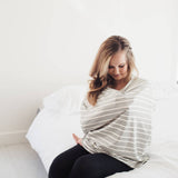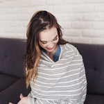• Stretchy fabric fits most all car seats, shopping carts, high chairs and nursing mothers. It can also be a trendy infinity scarf! The tan and white striped fabric is gender neutral and trendy
